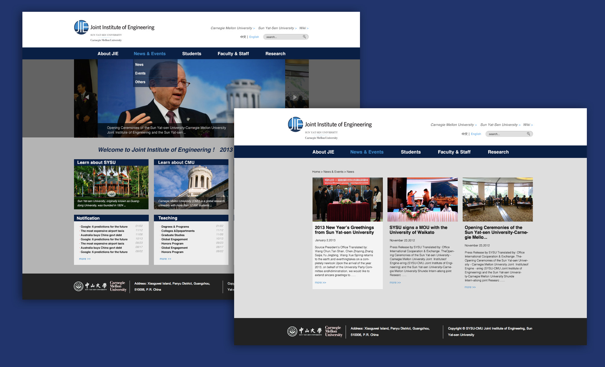 Joint Institute of Engineering(JIE) is an international collaboration between Carnegie Mellon University and Sun Yat-sen University to innovate engineering education. The website of JIE takes the responsibilities of promoting JIE program, logging into online admission application system, and knowing all latest news. It is the first impression of all Chinese students interested in joining CMU-SYSU JIE program.